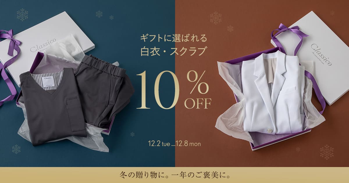 12月2日(火)から12月8日(月)の7日間限定で、ギフトに選ばれるスクラブ&白衣を10%OFFにてご提供します。