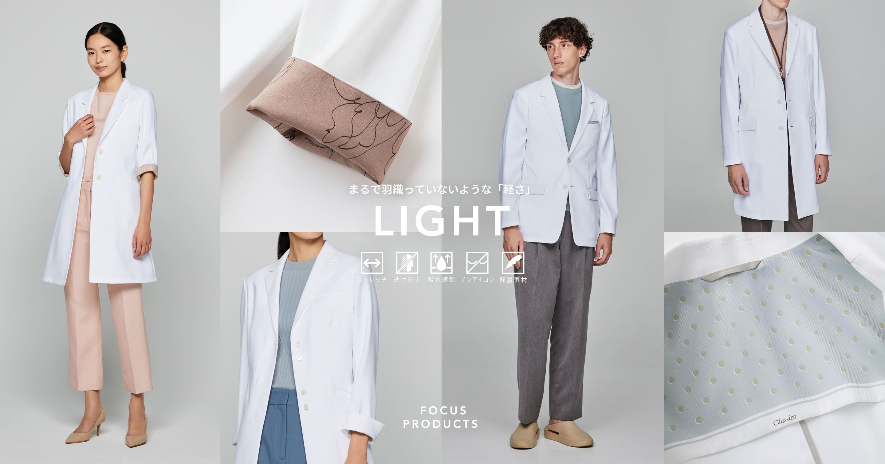 歴代人気白衣の生地の良いところを一つに凝縮してアップデートした「ライトジャージー」シリーズ。軽くて柔らかい肌触りに加え、伸縮性、吸水速乾性、ノンアイロンなど欲しい機能を網羅しています。