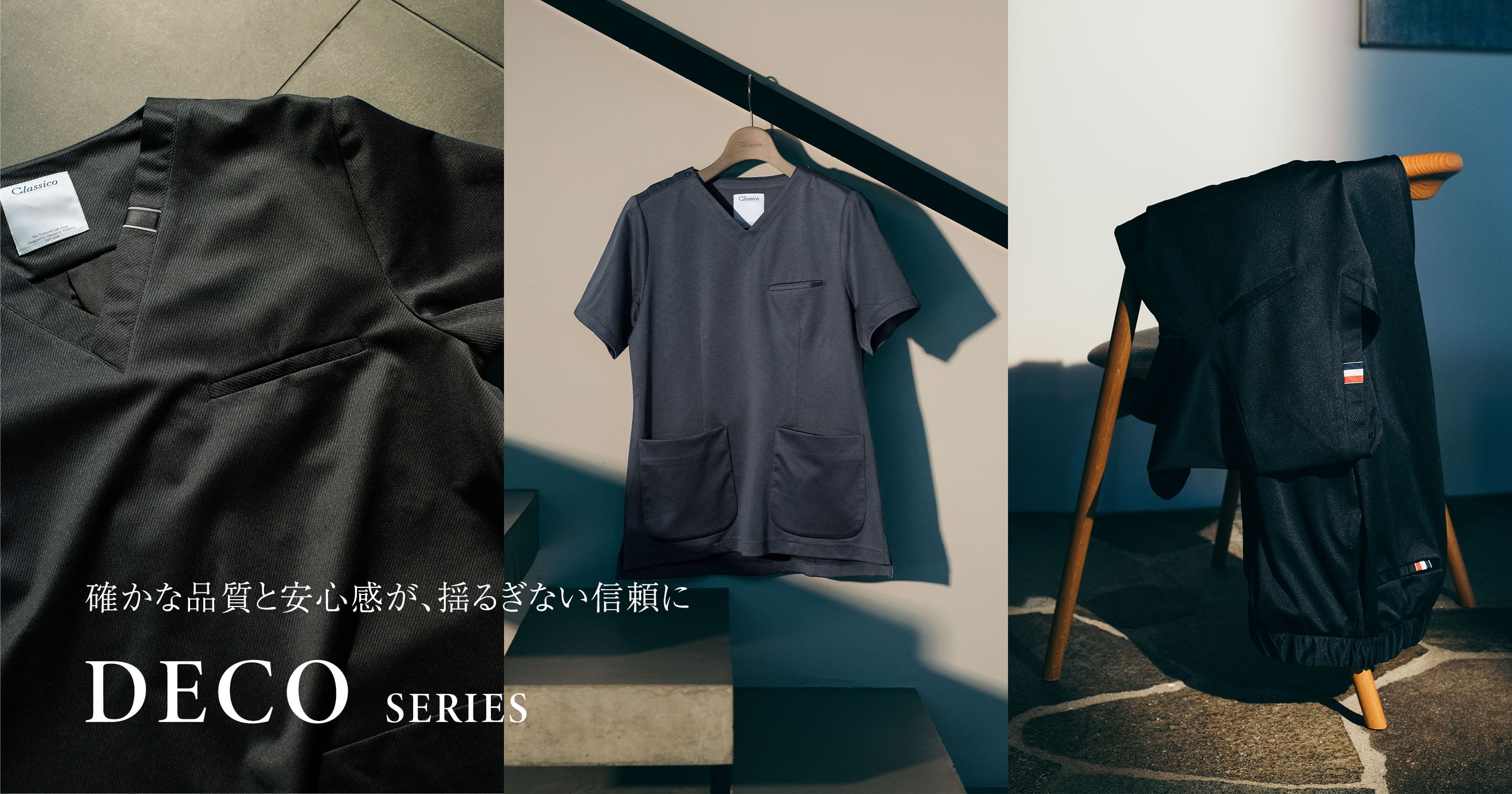 日常着のような心地よさと、プロフェッショナルにふさわしい美しさを両立した定番シリーズ。ストレッチ性に優れた上質な生地が、アクティブな医療現場をサポートします。