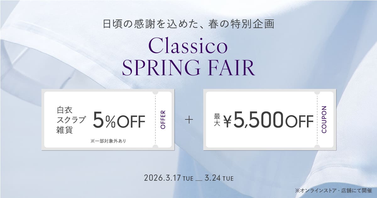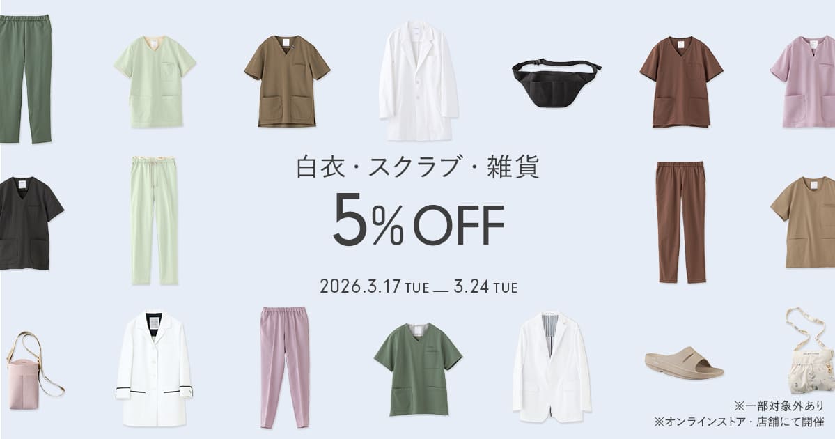 期間中、白衣・スクラブ・雑貨を5%OFFにてご提供いたします。
