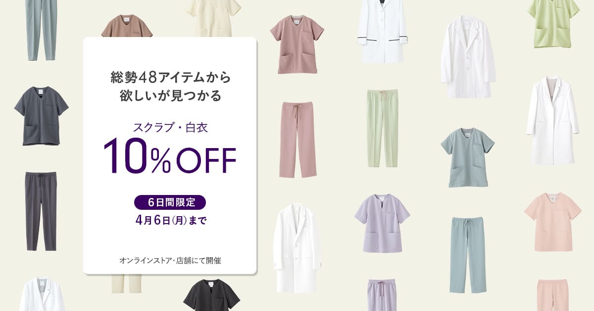 4月6日(月)まで、一部の白衣・スクラブを10%OFF価格にてご提供いたします。クラシコの逸品白衣をメインに、クールテックシリーズなどこれからの季節に嬉しいラインナップも対象のセールが開催