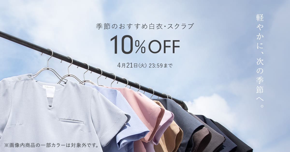 4月21日(火)まで、一部の白衣・スクラブを10%OFFにてご提供いたします。軽やかで洗練された印象が叶う「TROシリーズ」をはじめ、これからの季節にぴったりな人気アイテムをピックアップ。